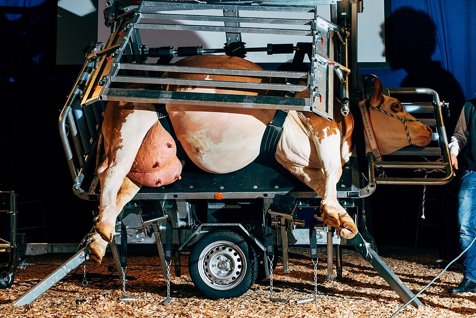 Die Betriebe, in denen ich ausgebildet wurde oder als Werkstudentin arbeite, haben einfachere Klauenstände. Meist wird die Kuh darin angehoben, dann arbeiten zwei Personen synchron, eine an den Vorderbeinen, eine an den Hinterbeinen und nach fünf Minuten ist alles vorbei.