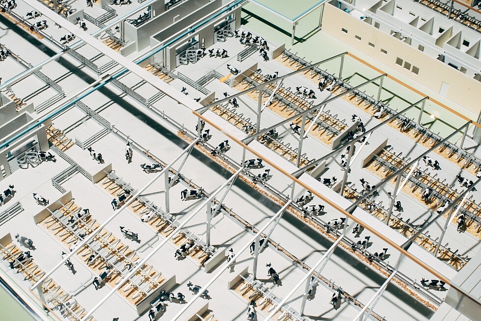 Dieses Modell zeigt einen hoch modernen Milchviehstall. Die Automatisierung macht auch vor der Landwirtschaft keinen Halt. Auch wenn uns die romantische Vorstellung von Kuh Britta auf der Alm ein besseres Konsumgefühl vermittelt, bedeutet es nicht, dass es einer Kuh ohne Weide schlechter geht.