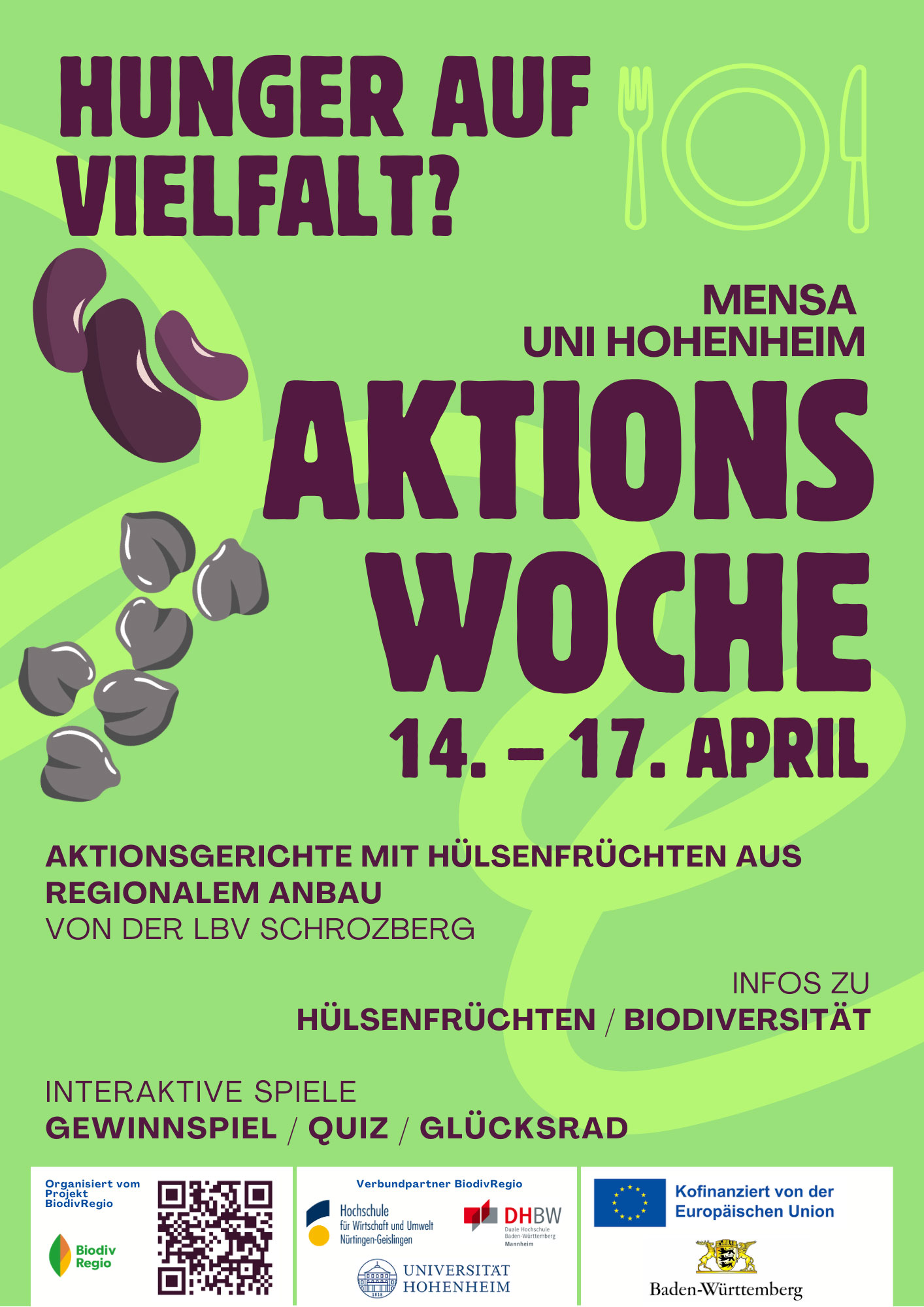 Unsere täglichen Essensentscheidungen beeinflussen nicht nur unsere Gesundheit, sondern auch die Biodiversität auf unseren Feldern. Die Gemeinschaftsverpflegung versorgt die Menschen in Deutschland täglich mit über 16 Mio. Mahlzeiten. Sie ist in diesem Zusammenhang ein wichtiger Hebel um Transformationen anzustoßen und umzusetzen. Im Rahmen der Aktionswoche „Vielfalt auf dem Teller!“ stehen daher Hülsenfrüchte und ihr Potenzial für eine vielfältige, nachhaltige Landwirtschaft im Mittelpunkt. An jedem Tag wird in der Mensa ein besonderes Aktionsgericht angeboten. Freut Euch auf leckere & abwechslungsreiche Gerichte mit regional erzeugten schwarzen Kichererbsen oder Kidneybohnen von der lbv-Schrozberg. Die Aktionswoche wird vom Projekt BiodivRegio an der Hochschule für Wirtschaft und Umwelt Nürtingen-Geislingen und der Universität Hohenheim gemeinsam mit dem Studierendenwerk Tübingen-Hohenheim gestaltet. Ziel ist es, die Zusammenhänge zwischen Ernährung und Biodiversität anschaulich zu vermitteln. Begleitend zu den Aktionsgerichten erwarten Euch ein Aktionsstand mit interaktiven Informationsangeboten, z.B. ein Quiz mit Gewinnspiel und einem Glücksrad mit spannenden Fragen rund um Hülsenfrüchte, Biodiversität und regionaler Wertschöpfung. Eine Aktionswoche zum Mitmachen, Lernen und Genießen! Für Studierende, Mitarbeiter:innen und alle Interessierten. Kommt vorbei!