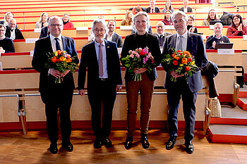 Rektor Prof. Dr. Christoph Schneider (ohne Blumen) mit den frisch im Amt bestätigten Prorektor:innen: Prof. Dr. Sebastian Hess, Prof. Dr. Julia Fritz-Steuber, Prof. Dr. Andreas Pyka (v.l.n.r.). Bild: Universität Hohenheim / Florian Klebs