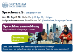 Nutzen Sie gerne auch die Beratungs- und Informationsangebote zum Semesterstart. Am heutigen Mittwoch (8.4.) findet von 12-14 Uhr zusätzliches unser traditionelles Sprachencafé in der Mediothek (Euro-Forum, OG) statt. Alle Lektorinnen sind anwesend, und Sie können sich bei einer kostenlosen Tasse Kaffee zum Kursangebot beraten lassen.
