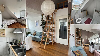 Beschreibung: Dachgeschosswohnung mit 1 Schlafzimmer, 1 Wohn-Esszimmer, kleine Küche und Badzimmer sowie 1 kleine Balkon und kleine Zwischenebene zur Lagerung.