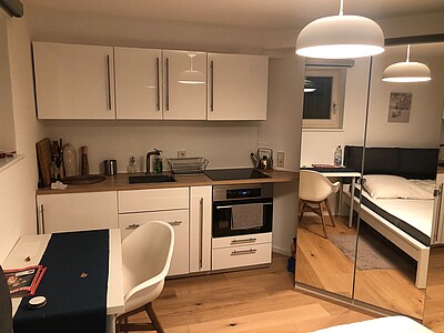 Das Apartment ist vollständig möbliert und ausgestattet mit einem Bett, Kleiderschrank, Tisch, Stuhl und Einbauküche.