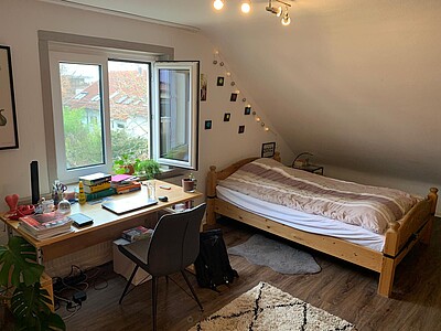 Mit 13qm ist das Zimmer das zweitgrößte der 4 Zimmer WG. Es hat ein Fenster in Richtung Osten und Dachschrägen. Außerdem hat es einen neu verlegten hochwertigen Vinylboden in Parkett Optik.