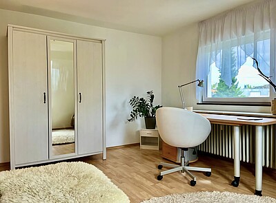 Dein Zimmer ist das größte in der Wohnung und liegt am Ende des Flures, so dass du absolute Ruhe genießt. Das Zimmer bietet dir einen schönen Platz zum Arbeiten, Schlafen und Entspannen. Über ein zwei schönes Fenster wird der gesamte Raum mit Licht durchflutet. Das Zimmer ist mit einem gemütlichen Bett, Nachttisch, Kleiderschrank, Schreibtisch + Stuhl, Sessel, Teppiche ausgestattet. Die leichte Dachschräge, die überhaupt nicht stört, bringt Gemütlichkeit und Behaglichkeit.