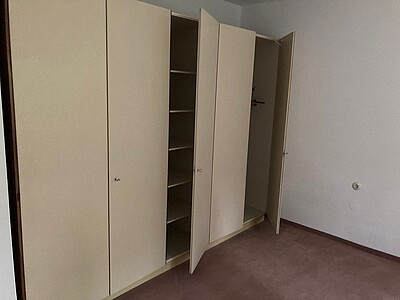 Teilmöbliert mit Schrank und Schreibtisch mit Blick in den Garten.