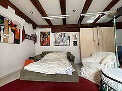 Ein Teil vom Atelier ist durch eine Kunstausstellung geschmückt. Die Suite wird vom Gast mit den Künstlern geteilt, die nach Absprache vorbei schauen.